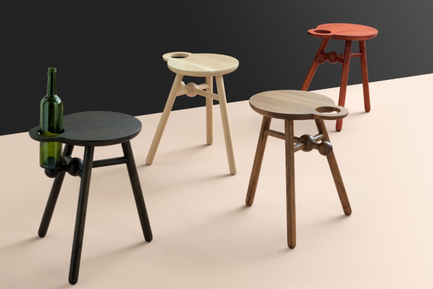 Bijzettafel Bottle Stool was eigenlijk al bij de introductie een klassieker. Het is een fleshouder, krukje, kaasplateau en bovenal een tafeltje dat elke blik naar zich toetrekt. De Bottle Stool is handig en mobiel, doordat de ‘ring’ die de wijnfles vasthoudt, ook dienstdoet als handgreep. Het aantal functies dat Jos Kranen en Johannes Gille in één ontwerp hebben weten te vangen, is indrukwekkend.