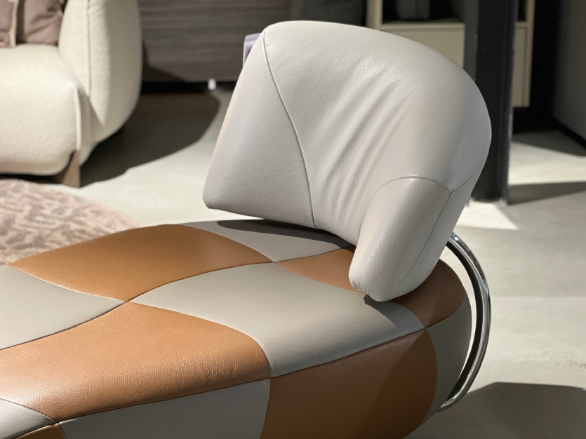 Bij de eerste aanblik laat Kikko je even in verwondering. Is het een chaise longue? Ja, maar deze ‘multifunctional’ heeft meer mogelijkheden. Door de rug te verstellen, draait hij 90 graden links- of rechtsom. Zo verandert de chaise longue in een comfortabele zitplaats met een extra zitplaats ernaast. Het draaibare frame dat de rugleuning ondersteunt, is naast functioneel ook bijzonder fraai om te zien. De indeling van de bekleding in vakken biedt een unieke kans om met de bekleding te spelen en het design te benadrukken. En dat is precies wat wij gedaan hebben; een speelse combinatie van twee kleuren Senso leder op de zitting. Dit hoogwaardige leer is extra goed beschermd is tegen invloeden van buitenaf, zoals licht, vuil en stof. De huiddikte en de robuuste structuur van het leer geven de Kikko een bijzonder cachet dat de liefhebber van zware lederkwaliteiten aanspreekt. Grijp uw kans om dit multifunctionele topstuk tegen een speciale prijs te bemachtigen!