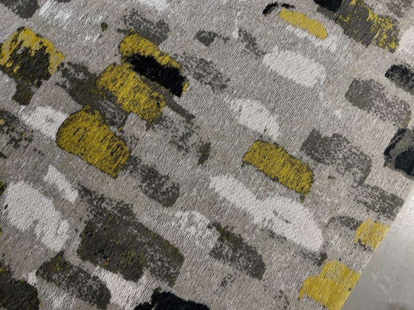 Het Murano Sunflower vloerkleed heeft een opvallend patroon van schilderachtige penseelstreken in witte, grijze en gele tinten. Dit unieke platgeweven vloerkleed combineert heldere en diepe gele kleuren voor een speels en dynamisch effect in je interieur.